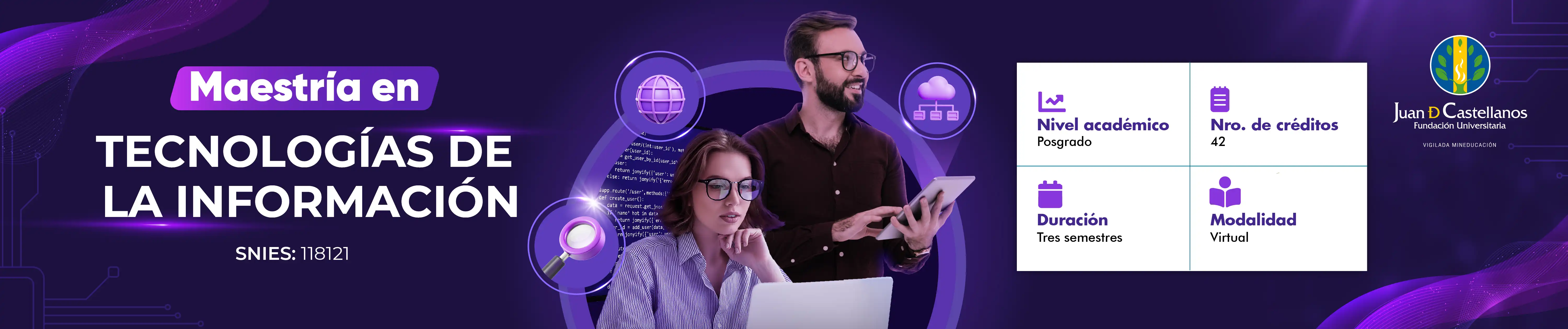 Con la Maestría en Tecnologías de la Información de la Juan de Castellanos podrás convertirte en protagonista de la innovación tecnológica en el país. Fórmate en áreas clave como Inteligencia Artificial, Big Data, Ciberseguridad e Ingeniería de Software, de la mano de expertos y en un entorno investigativo de alto nivel. Da el siguiente paso en tu carrera y genera soluciones que transformen la región y el mundo.