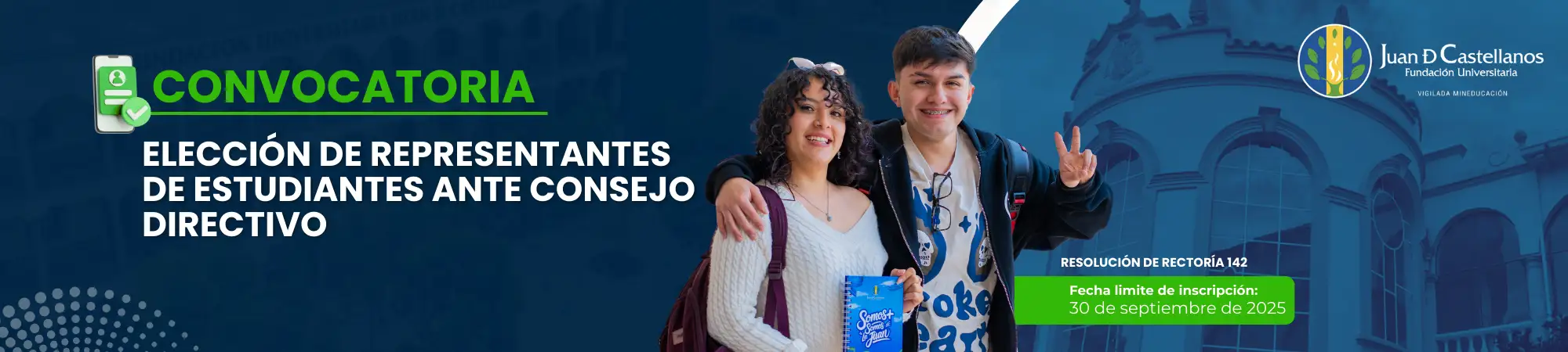 En el marco de la convocatoria realizada mediante Resolución de Rectoría No. 142 del 20 de agosto de 2025, la Fundación Universitaria Juan de Castellanos presenta a los candidatos inscritos para la elección de representantes estudiantiles ante el Consejo Directivo, período 2026. A continuación, encontrarás sus propuestas y planes de gobierno.