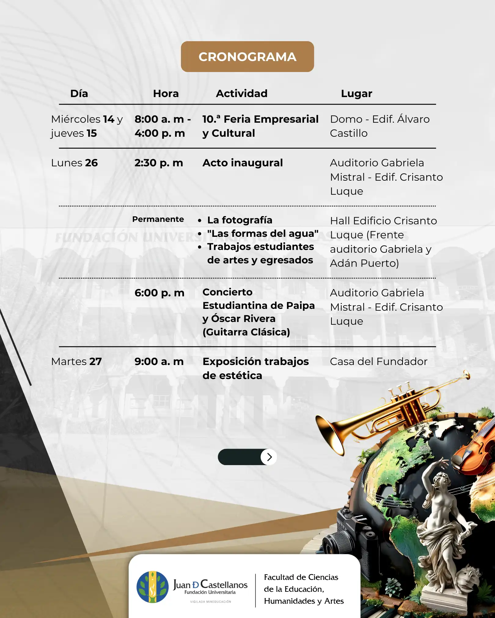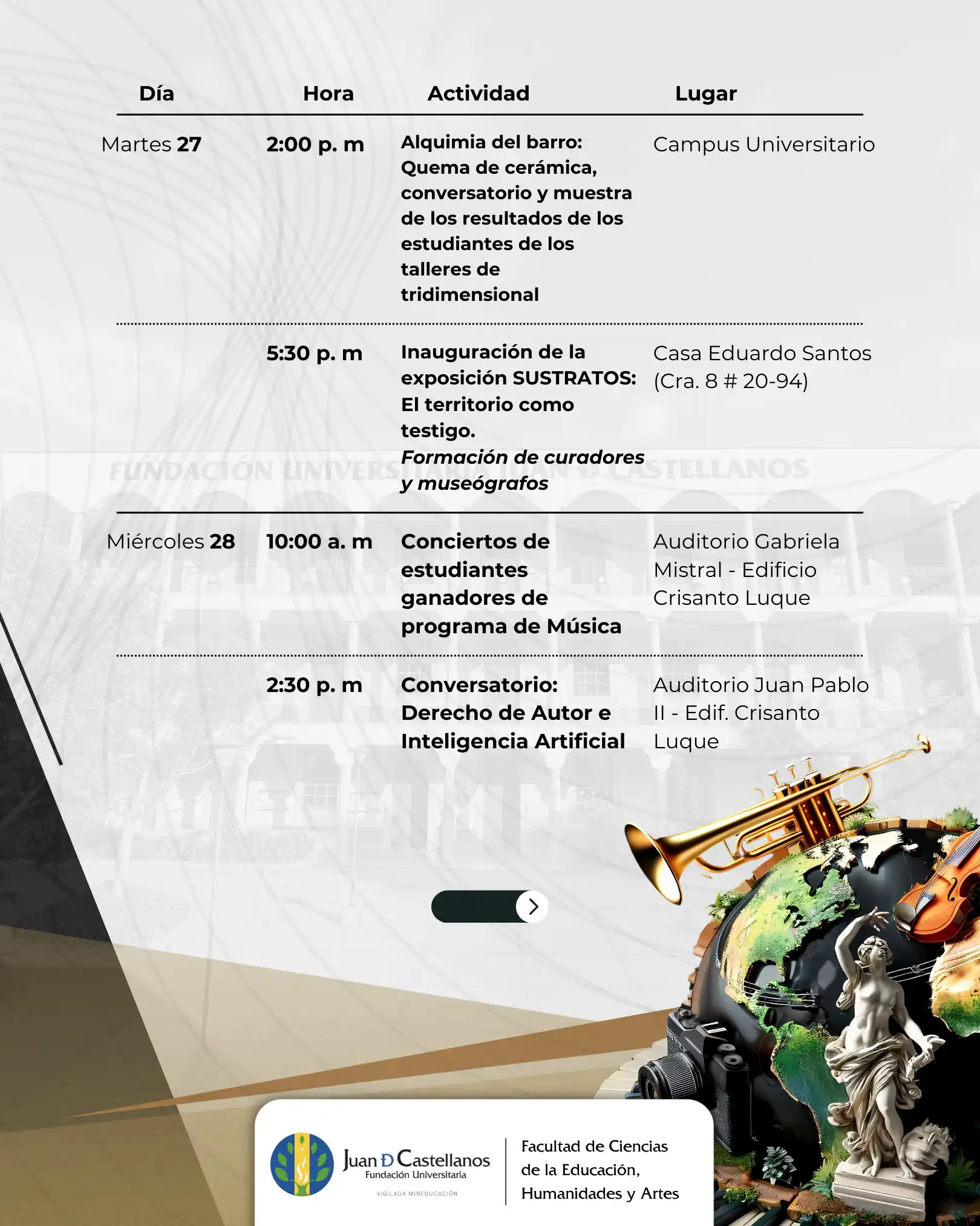 Del 26 al 30 de mayo de 2025, la Fundación Universitaria Juan de Castellanos vivirá una nueva edición de la Semana de las Artes y la Música, un evento académico y cultural organizado por los programas de Música y Artes Visuales de la Facultad de Ciencias de la Educación, Humanidades y Artes.