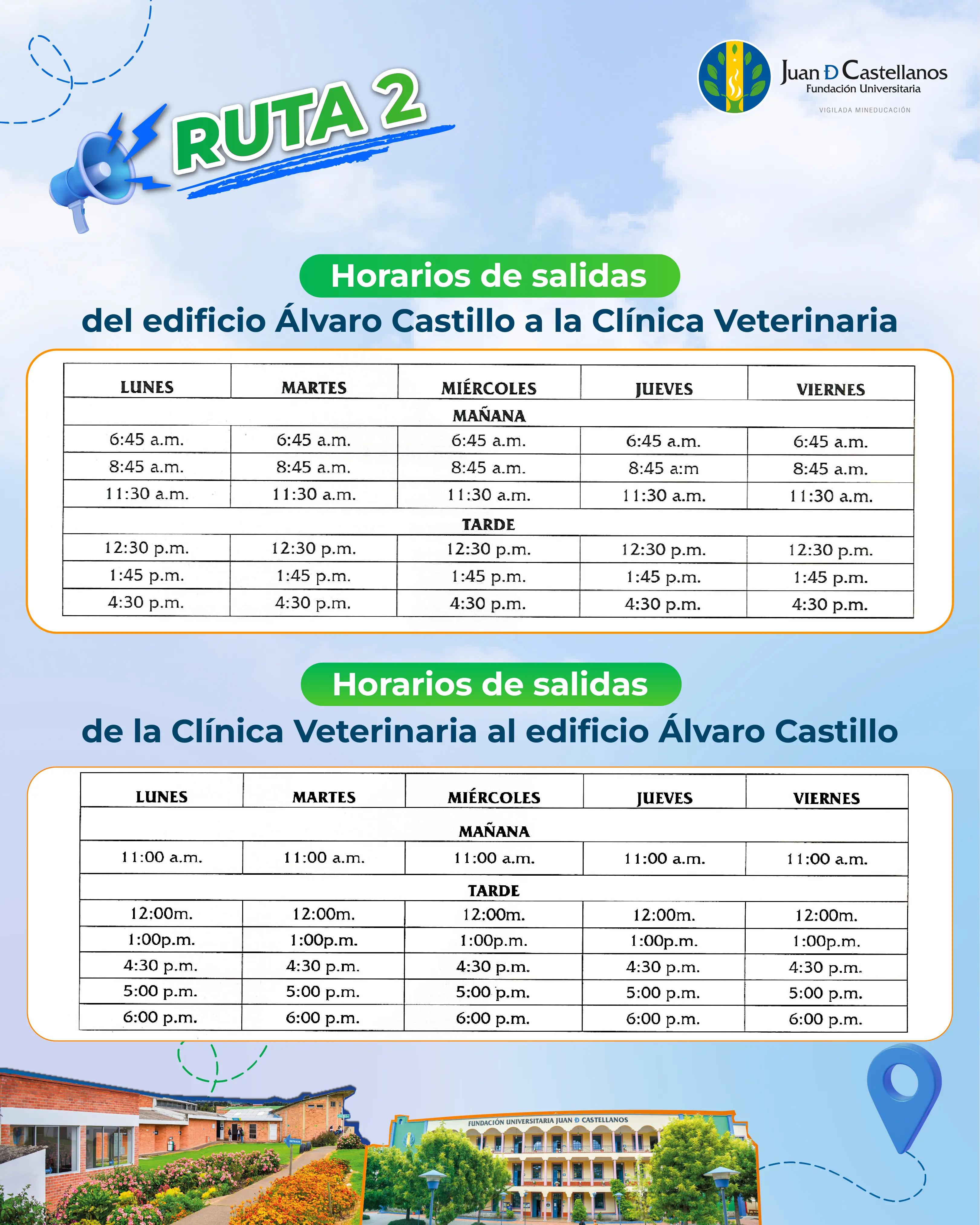 La Juan de Castellanos informa a la comunidad estudiantil y académica los horarios establecidos para el funcionamiento de las rutas de transporte universitario, las cuales facilitan el desplazamiento entre el Edificio Álvaro Castillo, la Clínica Veterinaria y el Campus Universitario.