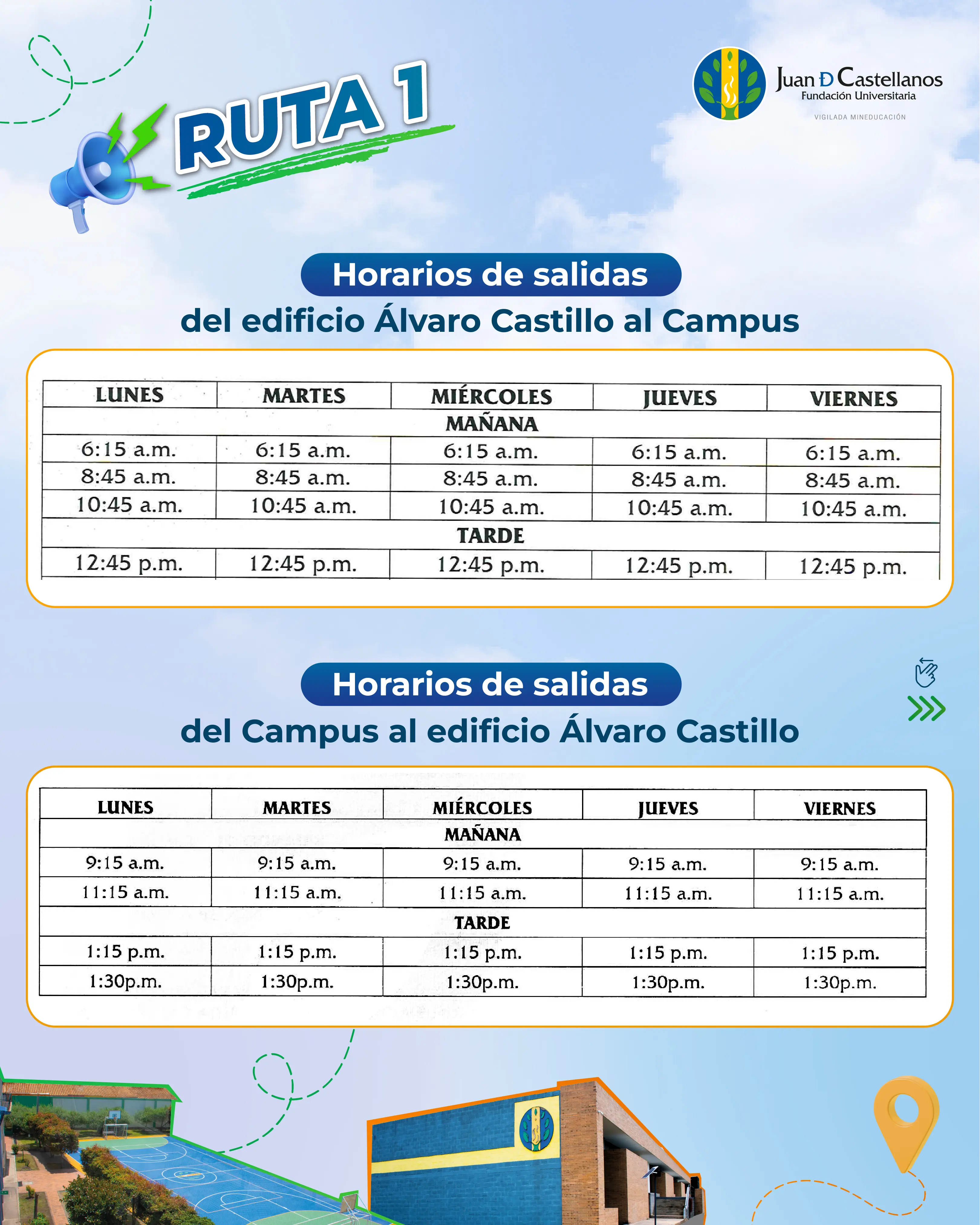 La Juan de Castellanos informa a la comunidad estudiantil y académica los horarios establecidos para el funcionamiento de las rutas de transporte universitario, las cuales facilitan el desplazamiento entre el Edificio Álvaro Castillo, la Clínica Veterinaria y el Campus Universitario.